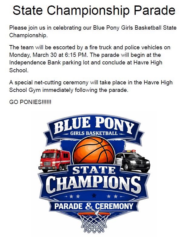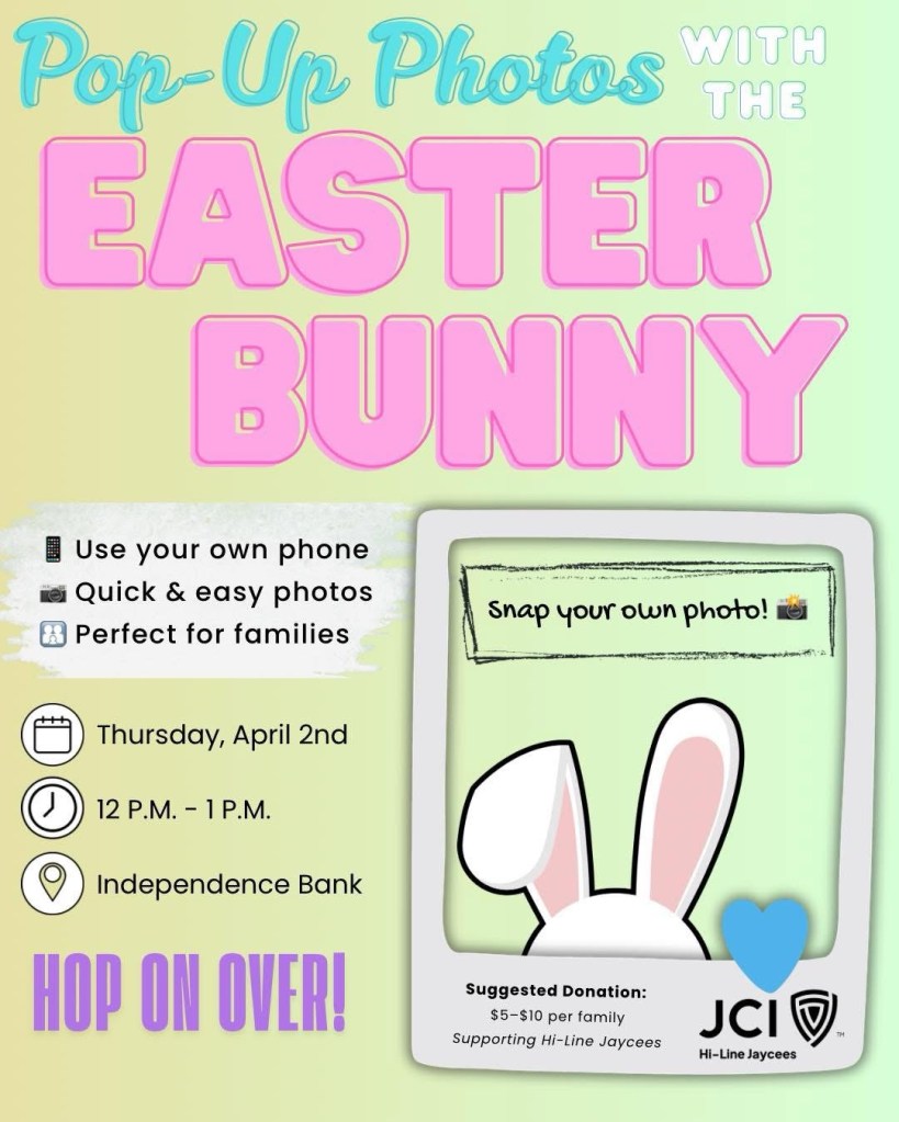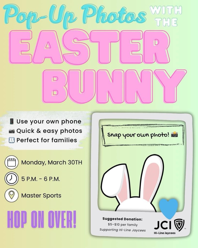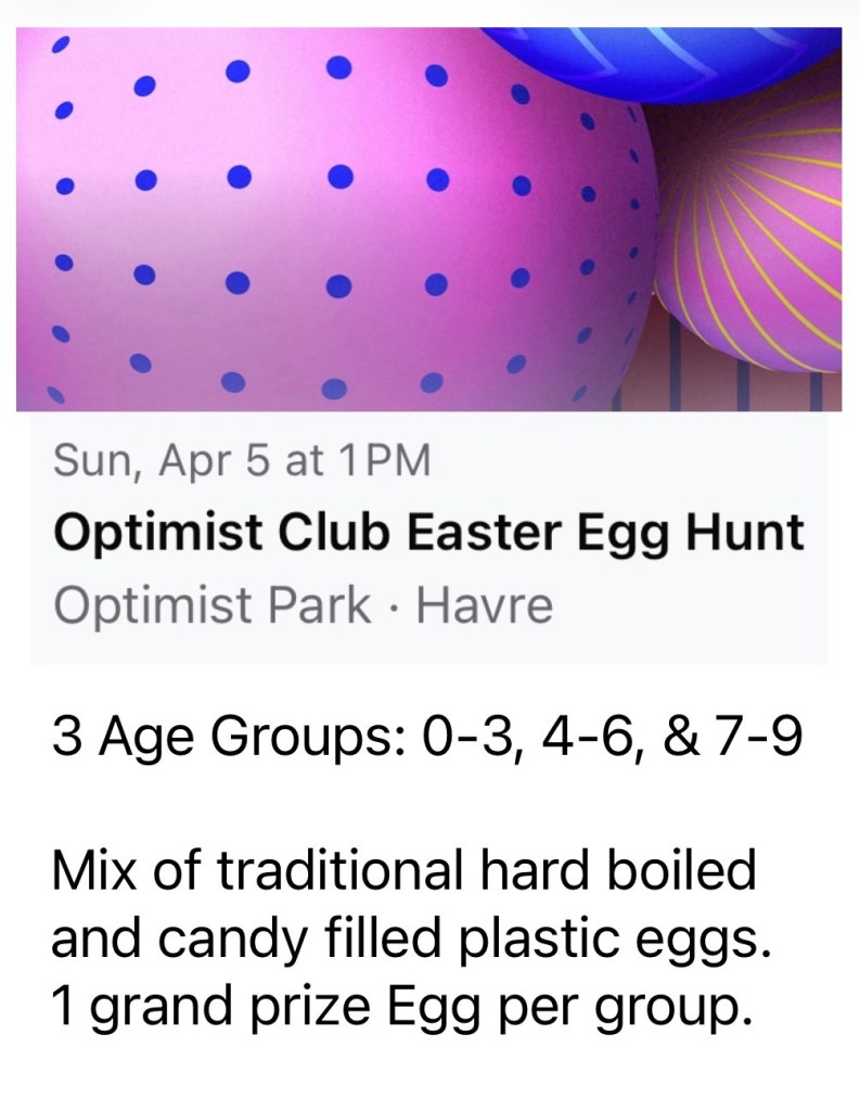 🐣Spring into a new week in Havre! Start things off with a visit to the Easter Bunny at Master Sports followed by a Hometown Parade for our Havre Blue Pony Girls Basketball State Champions! All sorts of events ranging from author spotlights and bull sales to CLUE Live at the High School and KNMC’s Newer Manure at Harvest Moon Lanes. Holy Week services will be available at many local places of worship and the weekend is jam packed with Easter Egg Hunts for the kids. Now, hop to it – we’ll see you out there! 🐇